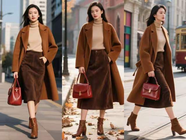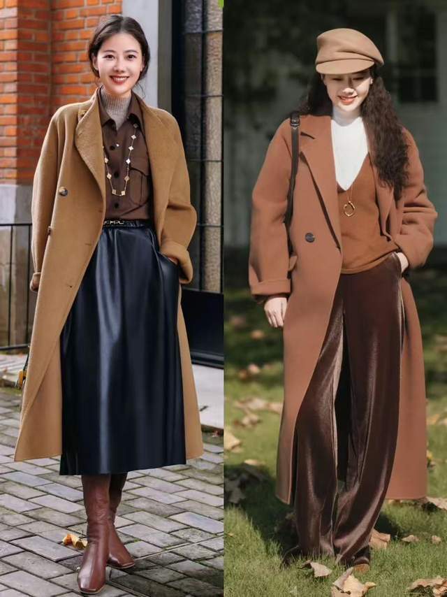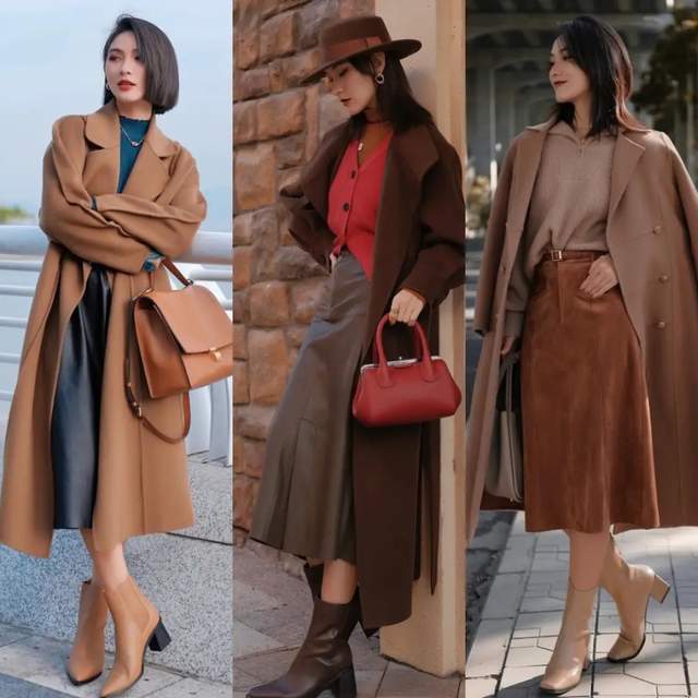 就算在寒冷的冬季,女人们都喜欢把自己打扮的优雅得体一些,这样就变得简单多了,直接选一件驼色大衣外套和驼色A字半身裙组合,衣服颜色能打破冬季的沉闷感,A字半身裙能修饰胯骨腿粗等问题,上面这一身穿搭确实经典!