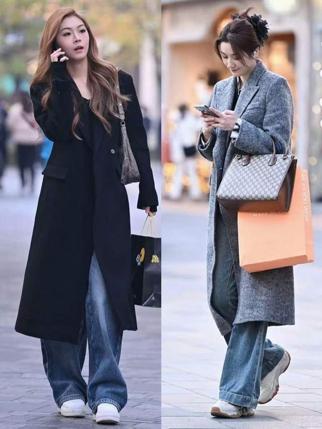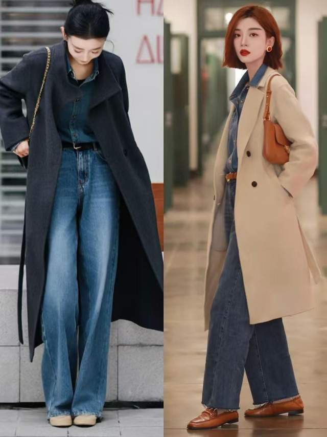 面料柔软,裤子是阔腿裤的款式,恭喜你,穿上这条牛仔裤和有垂坠感的大衣外套,咱们就能穿出慵懒感的造型了。