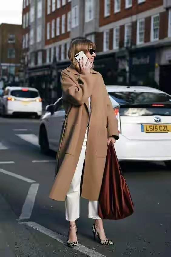 或者像下面这套衣服一样,浅驼色大衣搭配白色九分裤,时尚性和实用性就很高。
