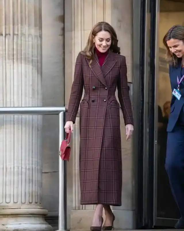 格纹大衣外套天生拥有时尚元素,简约不失高级感,凯特王妃的这一件大衣外套还做高腰收腰设计,长度在脚踝和小腿肚中间,这样的大衣版型不光能形成“高腰线”,同时还遮住了胯宽腿粗等问题,一件大衣就能穿出高贵气质,谁不喜欢这样的衣服!