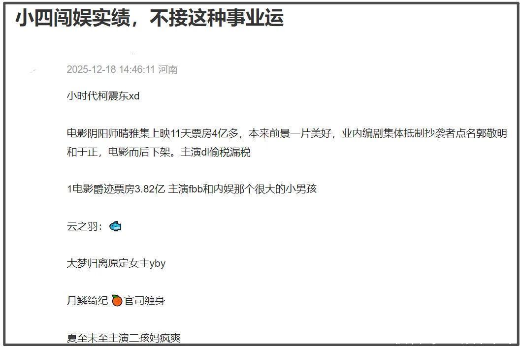 倘若扩大面积数一数,郭敬明假名张弋敏导演的《大梦归离》,原定女主是袁冰妍,这亦然个偷税的。