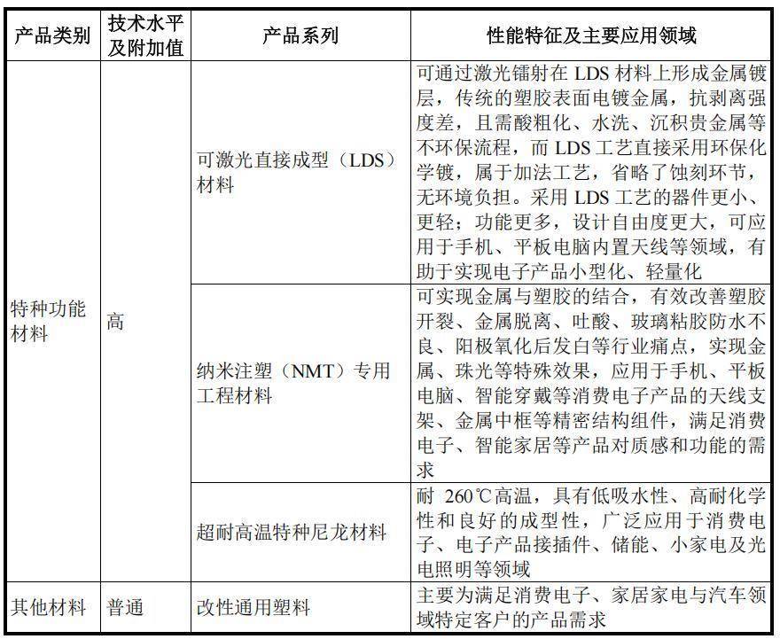 公司坚握自主研发并握续丰富居品系列,中枢居品包括改性 PC、PC/ABS、PA、PPA、PBT、PET 等高性能工程材料,并针对客户居品对电气互联、低介电、耐高温、防水散热性等特定需求,开拓了可激光径直成型(LDS)材料、纳米注塑(NMT)专用工程材料、超耐高温特种尼龙材料等特种功能材料。