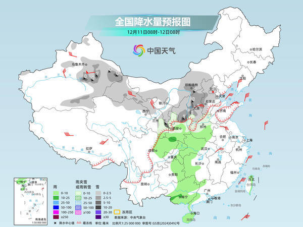 来日,新疆东部、内蒙古中西部、西北地区东部、华北、黄淮西部等地部分地区有小到中雪或雨夹雪,其中,新疆东部、内蒙古中部、甘肃东南部、陕西中部、山西西部等地部分地区有大雪。西北地区东南部、黄淮西部、江汉大部、湖南南部和西部、西南地区东部、华南西部等地部分地区有小到中雨。